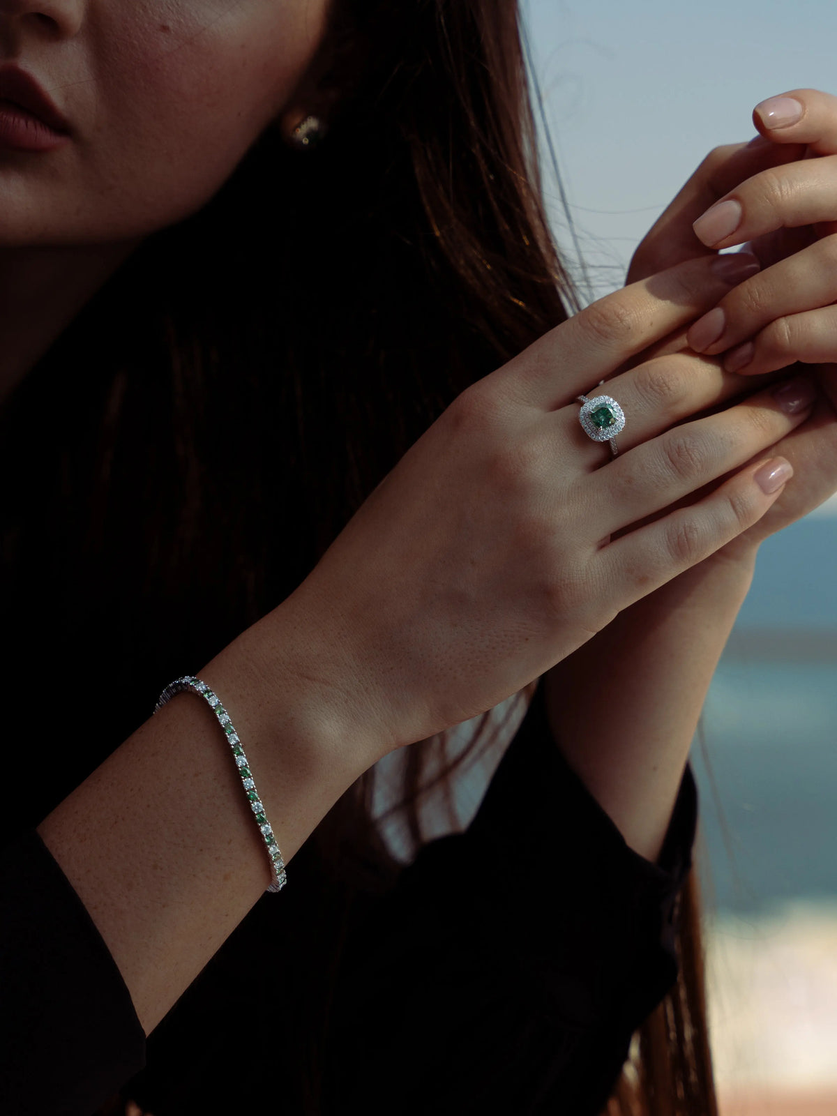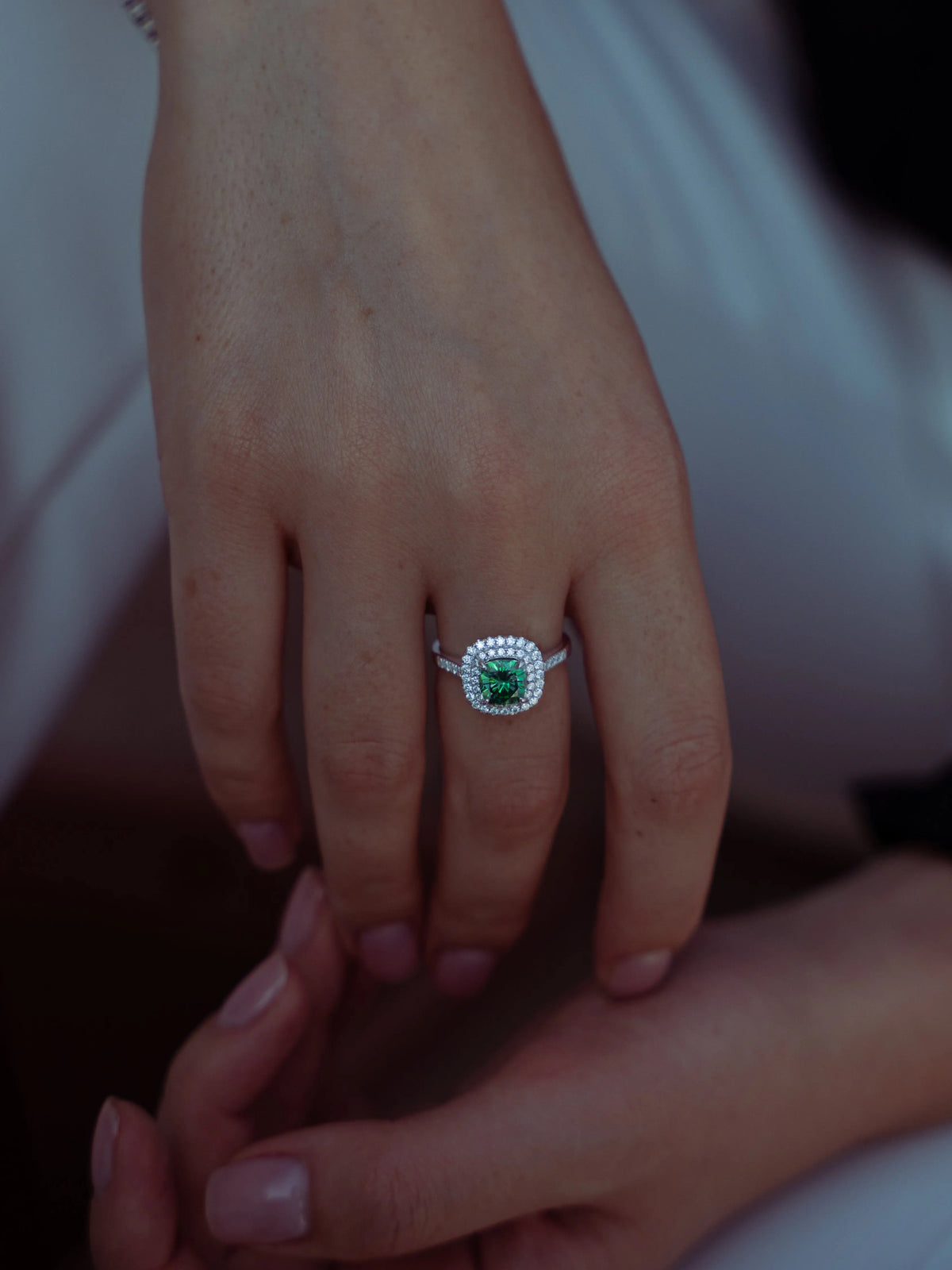 Experience the elegance and brilliance of the handmade Lab Grown Diamonds Cushion Cut Green Gemstone ring set within a Moissanite Diamond Inspired double halo design. This piece is crafted for customers who appreciate clarity, craftsmanship, and premium finishing. All gemstones used in this product are accurately described, and the centre stone is a vibrant green gemstone set within a design featuring Diamond Inspired Moissanite stones. The combination of rich emerald tone and high sparkle halo stones creates a luxurious and eye-catching appearance suitable for both daily wear and special occasions.
