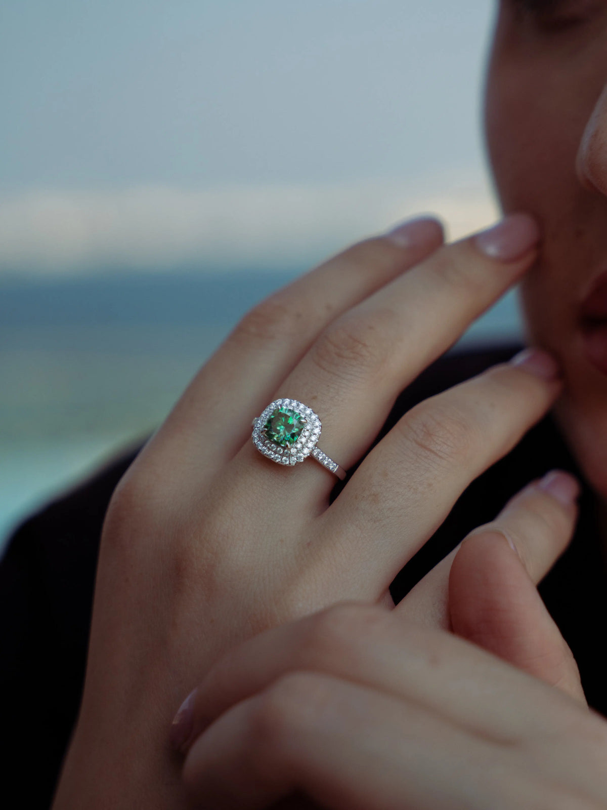 This handmade ring features a cushion cut green gemstone selected for its radiant colour and clarity. Surrounding the centre stone is a double halo of Moissanite Diamond Inspired stones set to a D Colour VVS1 clarity standard. These high-quality diamond-alternative stones are designed to provide exceptional brilliance while remaining fully transparent and correctly described.