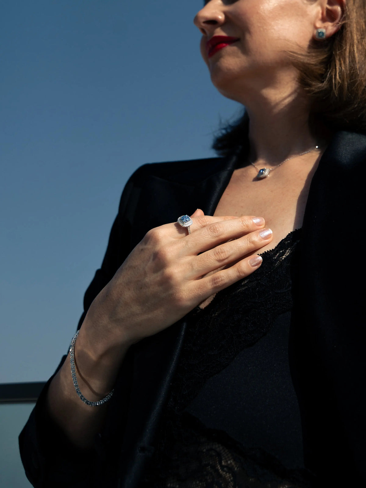 This handmade ring features a cushion cut blue gemstone selected for its vivid colour and clarity. Surrounding the centre stone is a double halo of Moissanite Diamond Inspired stones set to a D Colour VVS1 clarity standard. These high-quality diamond-alternative stones are designed to provide exceptional brilliance while remaining fully transparent and correctly described.